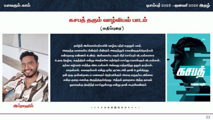 தமிழில் இஸ்லாமியர்களின் வாழ்வுப் பற்றி எழுதும் பலர், அரைத்த மாவையே மீண்டும் மீண்டும் அரைத்துக் கொண்டிருக்கிறார்கள் என்றொரு எண்ணம் உண்டு. இஸ்லாமிய மதம் மீறி செய்யும் விடயங்களாக உறவு பிறழ்வு, சுதந்திரம் என்று அவர்களே கற்பிதம் செய்து கொள்ளும் விடயங்கள், தர்கா வழிபாடு சார்ந்த விடையங்கள் அல்லது மந்தரித்து ஓதும் நபர்கள், காதல்கள், கலவரங்கள் என்று ஒரே குட்டையில் தான் உழல்கிறது. ஏன் ஒரு முஸ்லிமுடைய மனதைப் பிரதிபலிக்கும் அளவு எழுதப்படவில்லை என்ற குறை எனக்கு இருந்திருக்கிறது. அந்தக் குறையை இந்த நாவல் ஓரளவுக்கு நிவர்த்தி செய்துள்ளது என்று தான் கூறவேண்டும்.