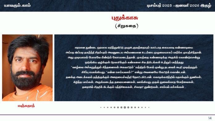 மஞ்சுநாத் – புதுச்சேரியை சேர்ந்தவர். விமர்சகர், பயணி, வரலாற்று ஆய்வாளர். தற்போது புதுச்சேரி அரசின் ஆயுஷ் துறையில் மூத்த சித்த மருத்துவ மருந்தாளுநராக பணியாற்றுகிறார். குதிரைக்காரனின் புத்தகம், உடனுறை இடாகினி ஆகிய சிறுகதைத் தொகுப்புகளும், டால்ஸ்டாயின் மூன்று கண்கள் கட்டுரைத் தொகுப்பும் வெளிவந்துள்ளன. சமீபத்தில் வெளியான ‘அப்பன் திருவடி’ நாவல் தமிழ் இலக்கியத்தில் இமயமலையின் பேரழிவு குறித்து முதல் முதலாக பேசி புதியதொரு களத்தையும் அறிமுகப்படுத்தியுள்ளது. மின்னஞ்சல் : manjunath.author@gmail.com