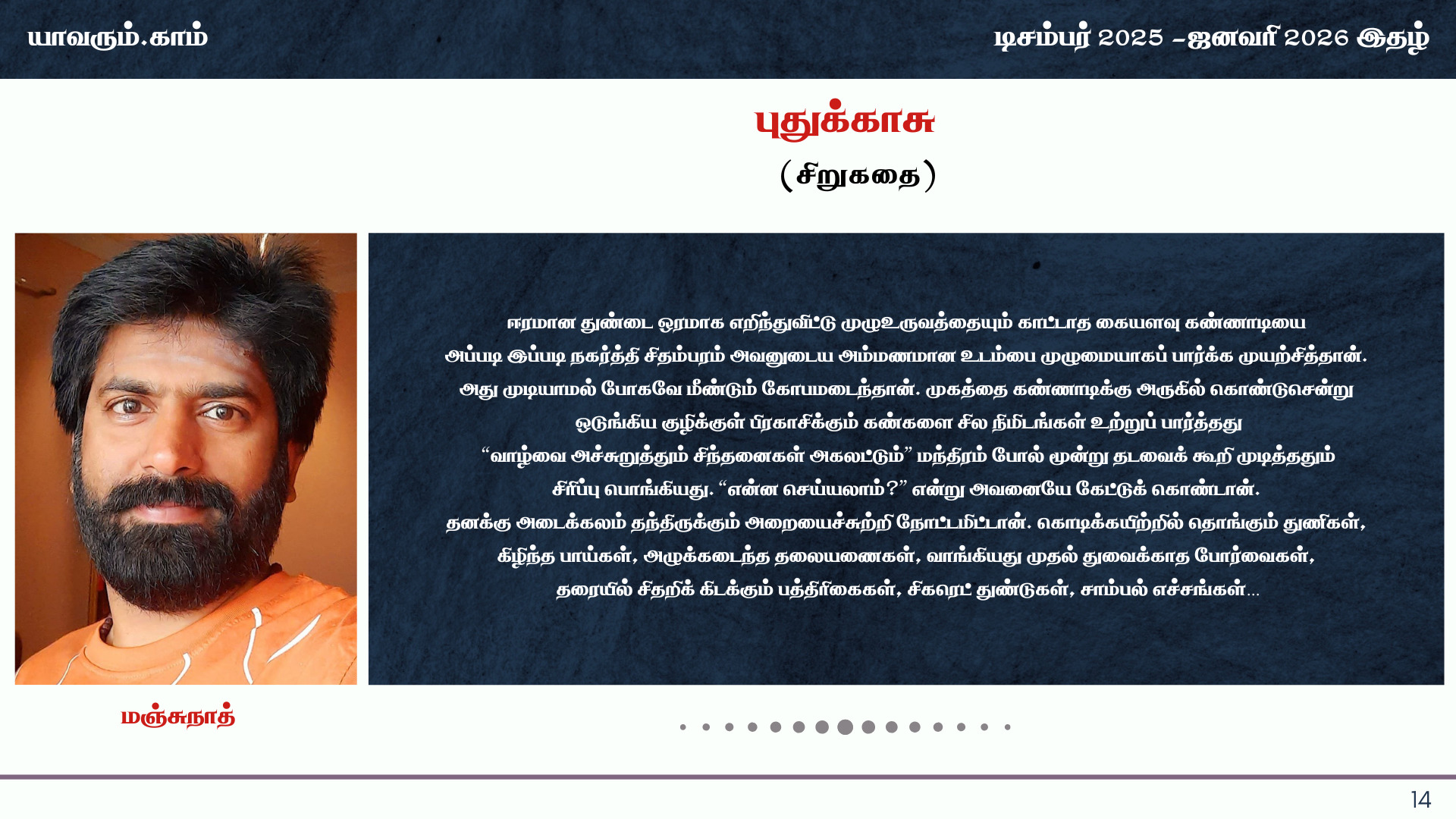“வச்சிகிணு இல்லைன்னா சொல்லுவானா இருந்தால் தரப்போகிறான். நாற்பத்தாறு வயசாச்சு, கல்யாணம் காட்சி பாக்காத ஜென்மம், பாவம் சாப்பாட்டுக்கே தரிகிட தத்தோம்… என்ன சிதம்பரம் காசில்லையா வயித்த இறுக்கி பிடிச்சிட்டு கெடக்கத? ஏங்கிட்ட கேட்க உனக்கென்ன கூச்சம்? இந்தா ஏதாவது வாங்கி சாப்பிடு.”