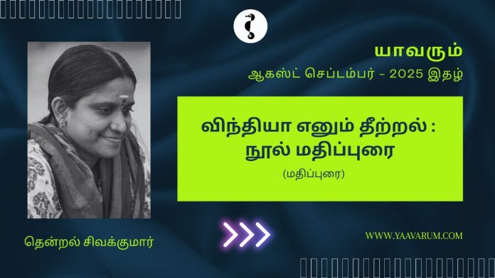 விந்தியா எனும் இந்திய தேவி 1927-இல் பிறந்து 1947 முதல் 1960 வரை சிறுகதைகள் எழுதியிருக்கிறார். அவர் வாழ்ந்த காலத்தில் அவருடைய சிறுகதைகள் தொகுக்கப்படவில்லை. 2025-இல் தொகுப்பாசிரியர் ரம்யா, விந்தியாவின் 26 சிறுகதைகளைத் தொகுத்து, நீலி பதிப்பக வெளியீடாக, அதாவது விந்தியாவின் முதல் சிறுகதைத் தொகுப்பை வெளியிட்டிருக்கிறார். எனில், கிட்டத்தட்ட ஆசிரியரின் நூறாவது வயதில் வெளியாகும் முதல் தொகுப்பு. தவிர, 1999-இல் மறைந்த விந்தியா 1960 முதல் 1999 வரையிலான நாற்பதாண்டு காலம் சிறுகதைகள் எதையும் எழுதவில்லை. இவ்விரண்டும் சேர்ந்த வினோதமான மனநிலை, மற்றும் கதைகள் எழுதப்பட்ட காலத்தை நினைவில் கொள்ளவேண்டும் என்ற கவனம் ஆகியவற்றுடன் மிக வித்தியாசமான வாசிப்பனுபவத்தைக் கொடுத்தது, ‘விந்தியா எனும் தீற்றல்.’